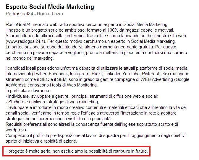 Cerchiamo di capire insieme gli errori che ci sono in questo annuncio, partendo dalla definizione di lavoro senza scomodare la Costituzione ma partendo dall’abc. Andando alla voce “lavoro” del dizionario Treccani, troviamo la seguente definizione: “Occupazione retribuita e considerata come mezzo di sostentamento, e quindi esercizio di un mestiere, di un’arte, di una professione“. Se scorriamo il vocabolario alla voce “volontariato”, possiamo scorgere questa definizione: “Prestazione volontaria e gratuita della propria opera, e dei mezzi di cui si dispone, a favore di categorie di persone che hanno gravi necessità e assoluto e urgente bisogno di aiuto e di assistenza, esplicata per far fronte a emergenze occasionali oppure come servizio continuo”.